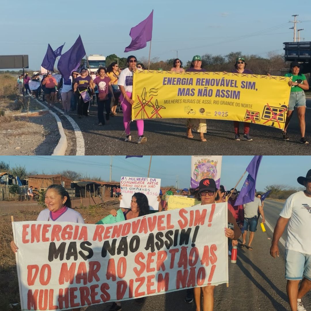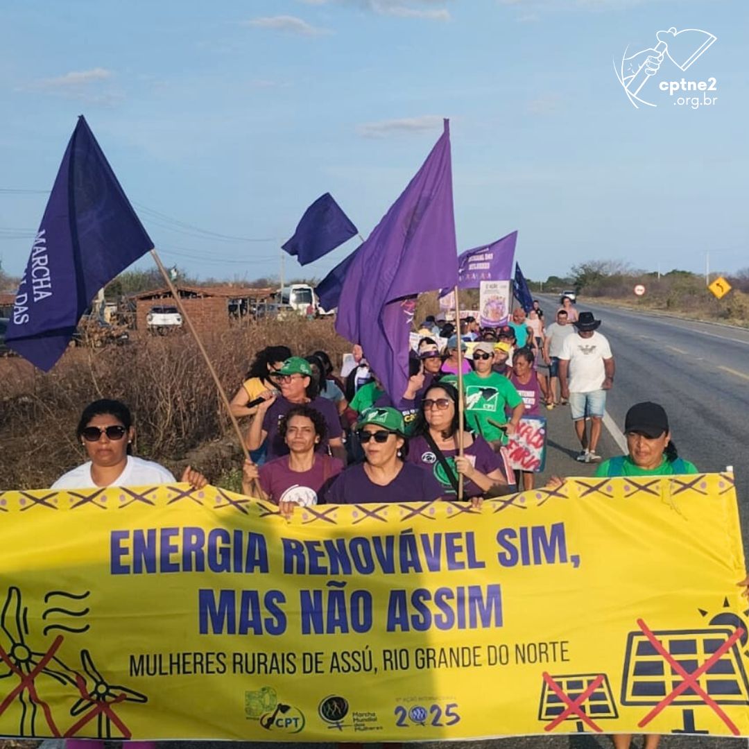 Mulheres camponesas participaram de uma marcha para gritar BASTA aos impactos e danos causados por grandes empreendimentos de energias renováveis que vêm afetando incontáveis famílias agricultoras no Rio Grande do Norte. Com o lema “Do mar ao Sertão, as mulheres dizem não!”, a marcha ocorreu no dia 27 de setembro, em Assu, e reuniu mais de cem camponesas de comunidades acompanhadas pela CPT e pelo CF8, como Artur Sabino, Maurício de Oliveira e o Acampamento Irmã Lindalva.